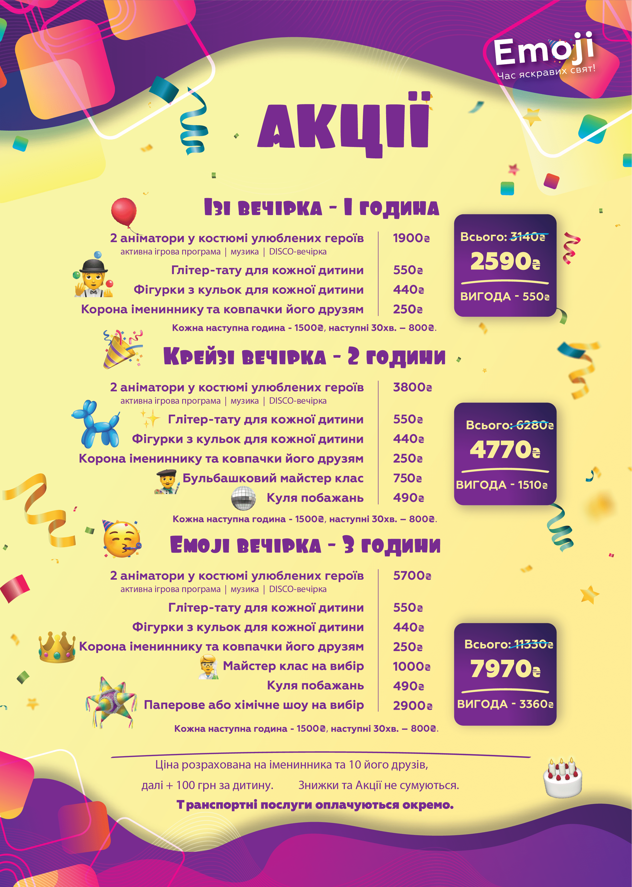 Для свята на День народження, кількість дітей 25, тривалість - 2 години